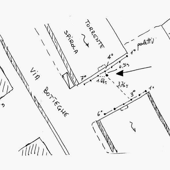 | materializzazione | Centrino metallico infisso sull'asse, bordo ovest, del ponte in cemento che accede al civico 15 di Via Botteghe. |