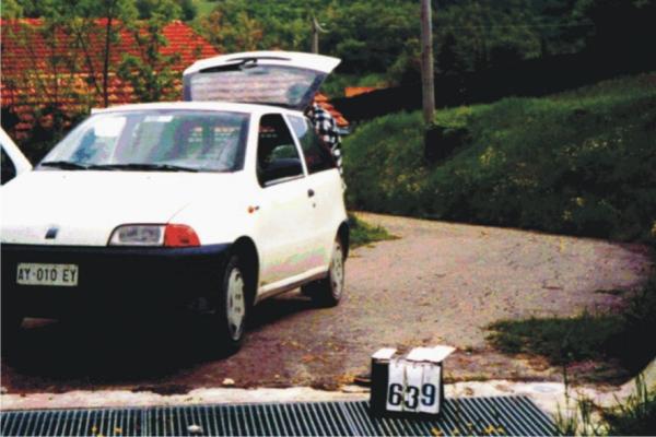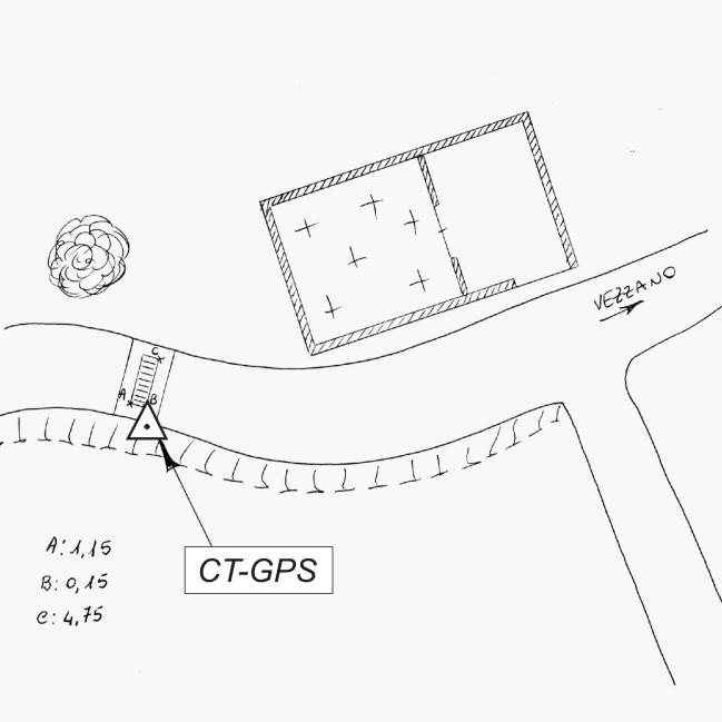 | materializzazione | Centrino metallico infisso sul cordolo della grata di raccolta delle acque situata sulla S.S. 63, a fianco del cimitero di Vezzano. |