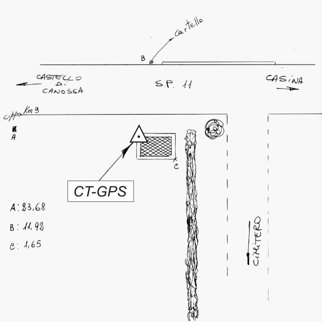 | Materializzazione | Centrino metallico infisso sul basamento in cemento del tombino SIP situato nei pressi del cimitero di Casina, vicina al cippo del km 19,000 della S.P. 11. |
