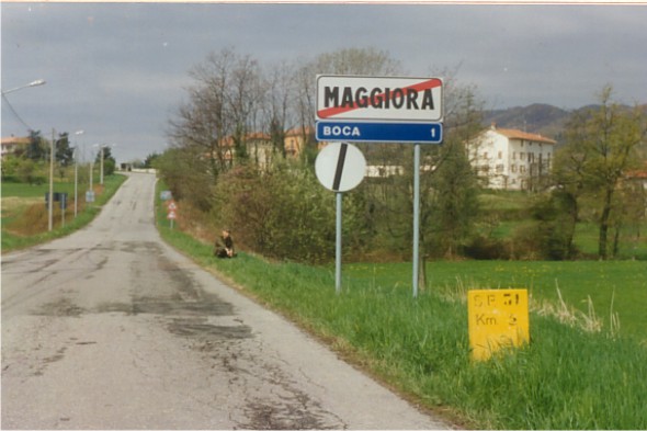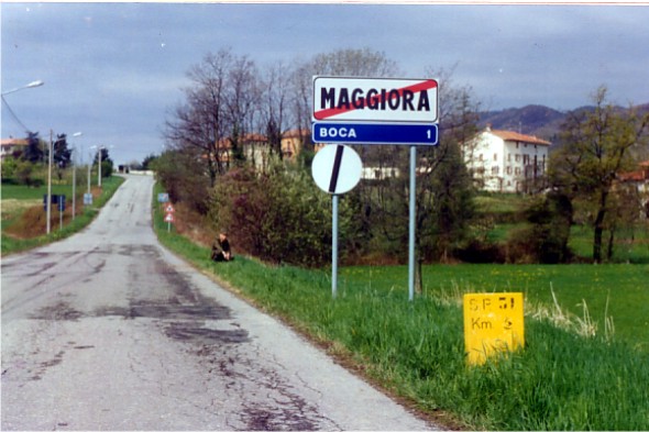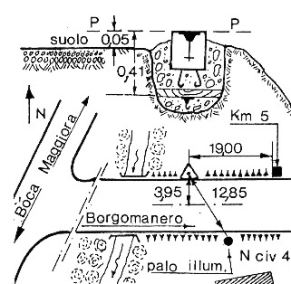 Sulla strada provinciale N. 31, nel tratto di circonvallazione di Maggiora, nei pressi del cippo del Km. 5. Centrino di fondo e in asse un centrino di superficie, cementati in blocchi indipendenti sul ciglio nord della strada. (GPS).