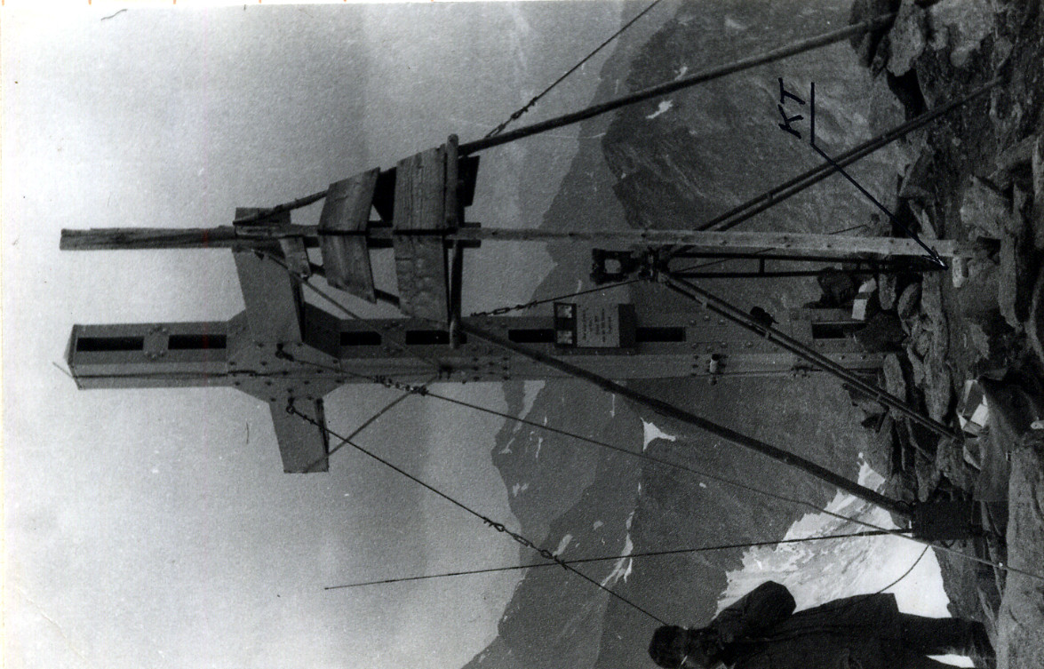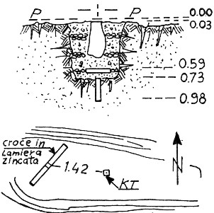 Segnale austriaco sullo sperone roccioso a circa 130 m. ad Ovest di Dosso del Bersaglio. Blocchetto di granito affiorante 3 cm dal suolo. e sottostanti piastra di mattone e tubo in ferro coassiali.