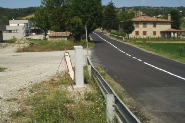 Centrino metallico infisso sullo spigolo sud ovest del basamento di una cabinetta ENEL all'accesso nord dell'Autocentro Venturelli.